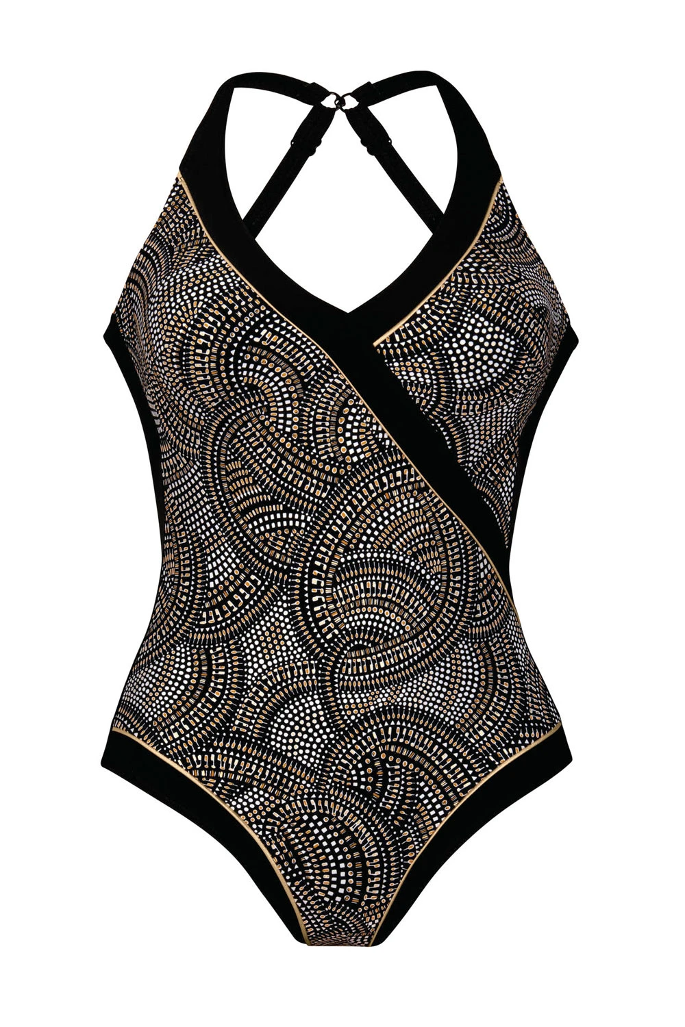 Der Badeanzug Nuria bezaubert mit verführerischem V-Ausschnitt und einem wunderschönen Mosaik-Print in den Farben Weiß, Gold und Schwarz. Uni-schwarze Blenden mit feiner goldener Paspelierung am Ausschnitt und an den Beinrändern modellieren den Körper für eine optisch schlanke Silhouette mit Slimming Effect. Der bügellose Einteiler hat formende Schalen und verstellbare Schulterträger, die sich am Rücken für einen noch besseren Halt auch in der in X-Form einhaken lassen. Die schnell trocknende, goldgesprenkelte Soft-Touch-Ware sorgt für ein tolles Tragegefühl.