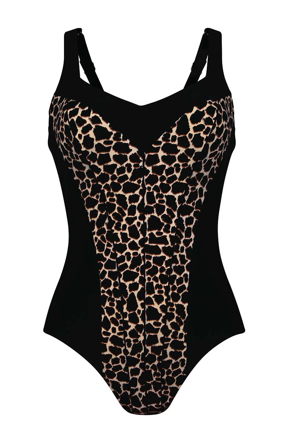 Trendiger Printstoff mit Giraffenfellmuster verleiht diesem Einteiler aparten Charme. Angeordnet in vertikalen Passen mit dezenten Teilungsnähten, erscheint das Modell dadurch verschlankend. Ein tiefer v-förmiger Ausschnitt bringt das Dekolleté sexy zur Geltung. Innen verbergen sich funktionelles Futter und Cupschalen, die Marke weist mittleren Support aus. Der Badeanzug verfügt über eine runde Rückenöffnung sowie parallel verlaufende verstellbare Trägerabschnitte. Die mittlere Vertikalnaht bleibt fast unsichtbar. Dank weniger hoher Beinränder wird der Po komfortabel umfasst. Das verwendete patentierte Lycra-Material verspricht dauerhafte Passform.