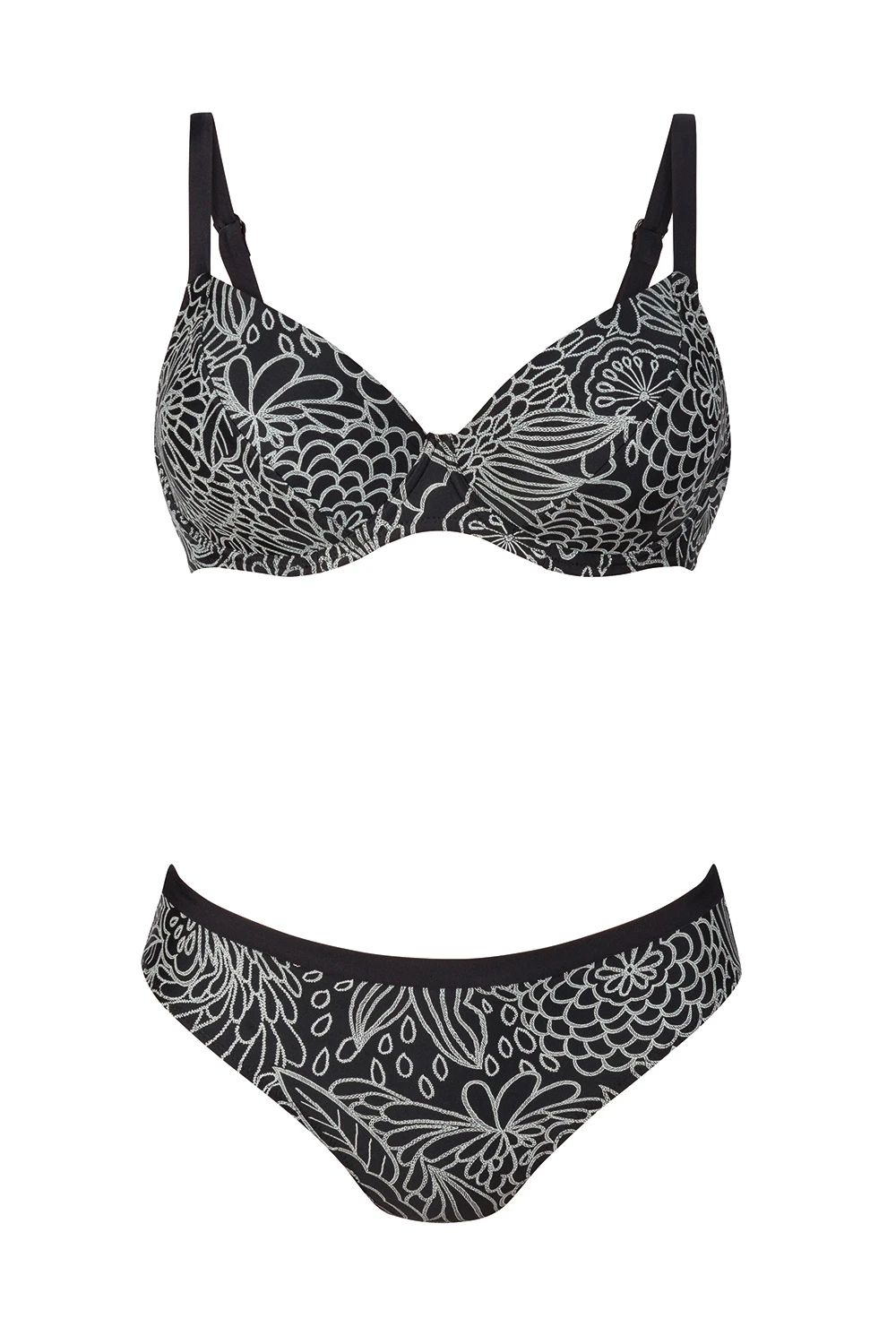 Das Bikini-Set Celine zeigt filigranes Spitzenmuster auf schwarzem Grund. Das Oberteil ist als Bügel-BH mit glatten Abschlüssen am Dekolleté gestaltet, das in V-Form umrahmt wird. Ein leicht taillierter Mittelsteg bildet eine gerundete Unterbrustlinie. Unifarbene, am Rücken verstellbare Träger setzen einen Kontrast zu dem über dem Cup zweiteiligen Bezugsstoff. Das schlicht geschnittene Höschen mit einfarbigem Bund punktet ebenfalls mit seinem floralen Fantasiedesign.