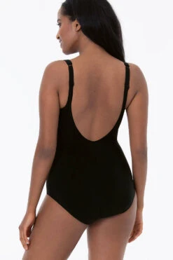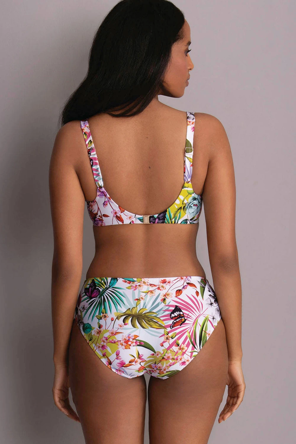 Der Serienname ist Programm! Das zeigt auch das Bikini-Set Hermine mit seinem herrlichen Dessin auf weißem Grund. Bunte Farben, Blüten, Palmblätter, Schmetterlinge – dieses Muster besticht. Konkret für Umfänge vom C- bis zum E-Cup sind diese Teile kreiert und sie tragen damit den entsprechenden Figurbedürfnissen Rechnung. Der Bade-BH gefällt unbedingt mit der drapierten Schärpe im Ausschnitt, und er bietet besten Sitz durch Bügelcups und breite Seitensichel, die direkt in die Träger übergehen. Hinten sind die Bänder längenverstellbar und münden in einen u-förmigen Rücken mit hochwertigem Clip. Der Slip erscheint schlicht, weist aber neben seiner moderaten Seitenhöhe beidseits hübsche Raffungen auf – kleine Kascheure. Die Beinränder und der hintere Bundabschnitt sind zickzack gesäumt, vorn spiegelt der nahtlose Umschlag die Eleganz dieser Linie wider. Veredeltes Material sorgt für langlebige Passform.