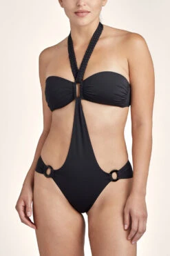 Der Trikini bietet eine außergewöhnliche Form: Er verbindet Bikini und Badeanzug auf gestalterische Art und Weise. Am festen Schalencup-BH à la Bandeau befindet sich mittig ein Ringelement, an dem ein Nackenband in Flechtoptik sowie die Befestigung der Vorderpartie realisiert werden. Zwei Ringe halten den Stoff für das Höschen mit rückwärtiger Naht, das den Po nur halb bedeckt. Der Neckholder kann abgenommen werden. Im Rückenband mit Clipverschluss sind Schlaufen für eine alternative Trägerführung integriert.