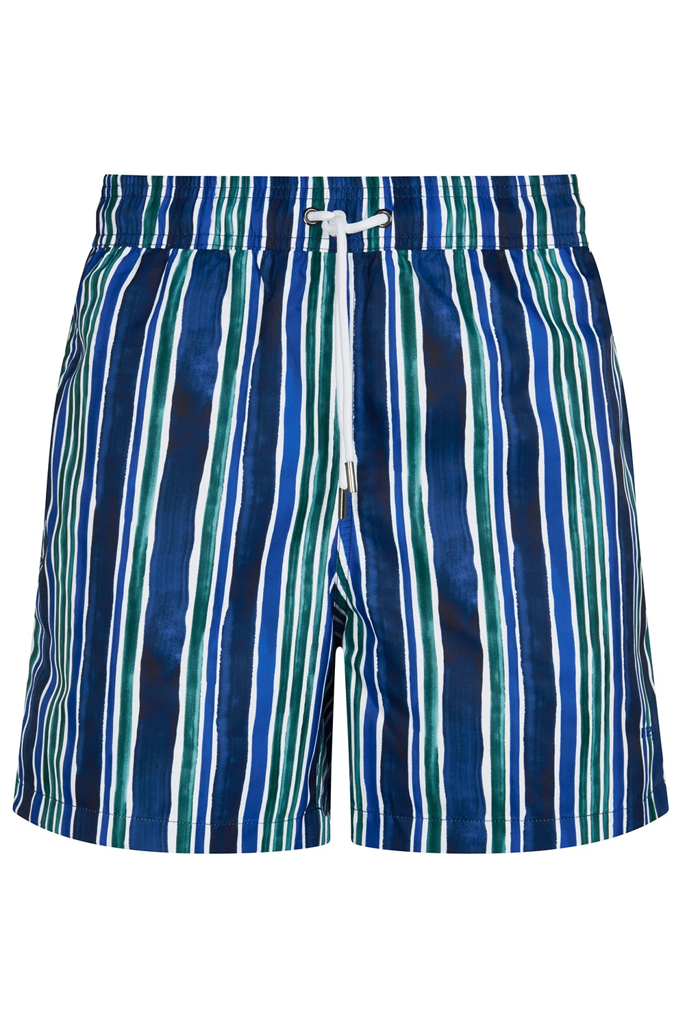 Diese Herren-Badeshorts gefallen mit ihren maritimen Farben und dem vertikalen Streifenmuster. Sie sind mit angesetztem geriehenem Bund gearbeitet, durch den eine weiße Kordel läuft. Metallene Ösen und Senkelenden verleihen ein souveränes Bild. Das Material ist chlorecht und meerwasserresistent. Dezent ist der Markenname an einer Beinseite eingestickt.