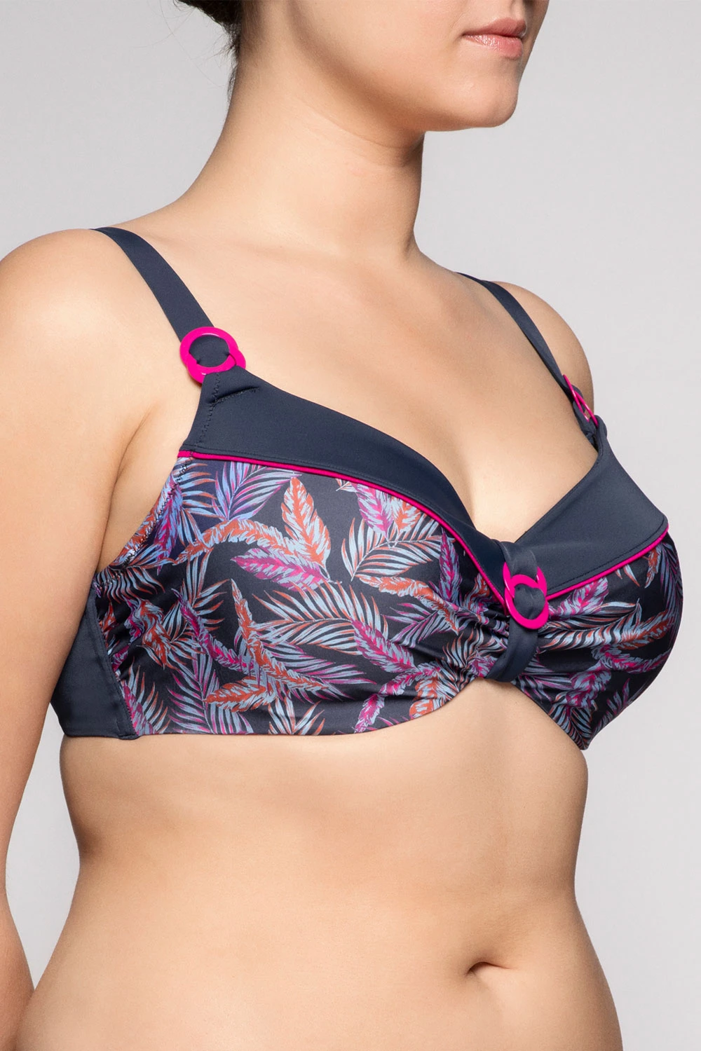 Dieses Bikini-Oberteil gefällt mit raffinierten Rüschungen und einer unifarbenen Blende an den Cups. Die innen liegenden, durch besonders weiches Band abgepolsterten Bügel formen eine perfekte Büste, bleiben aber unter dem Stoff völlig unsichtbar. Für Komfort und eine schöne Silhouette sorgt auch das dreigeteilt genähte Schauminnencup. Der modische Druck ist frisch, flache Ringe an Steg und Trägeransätzen beleben das Modell – genauso wie die zarte Paspellinie. Die funktionelle Rückenverarbeitung mit einem gut schließenden nickelfreien Bikiniverschluss gewährleistet besten Halt und somit Sicherheit.