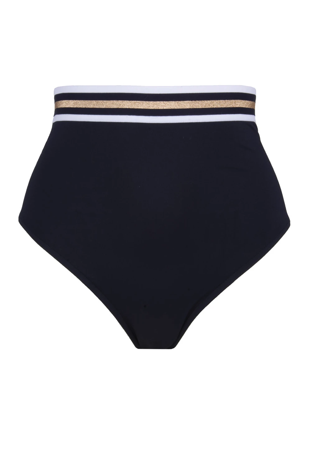 Dieser Bikini-Slip im Retrostil ist so hoch geschnitten, dass der Nabel nicht zu sehen ist und der gürtelähnliche Bund den Körper an schmalster Stelle in der Taille umfängt. Damit betont er die weibliche Silhouette vorteilhaft und verlängert optisch die Beine. Die sportiven Streifen in Weiß nehmen einen dritten mit Lurexgarn golden schimmernden in ihre Mitte. Das Höschen zeichnet sich durch zertifiziertes dichtes Strickmaterial mit Zweite-Haut-Effekt und herrliches opakes Marineblau aus. Es bietet perfekte Passform und trocknet schnell.