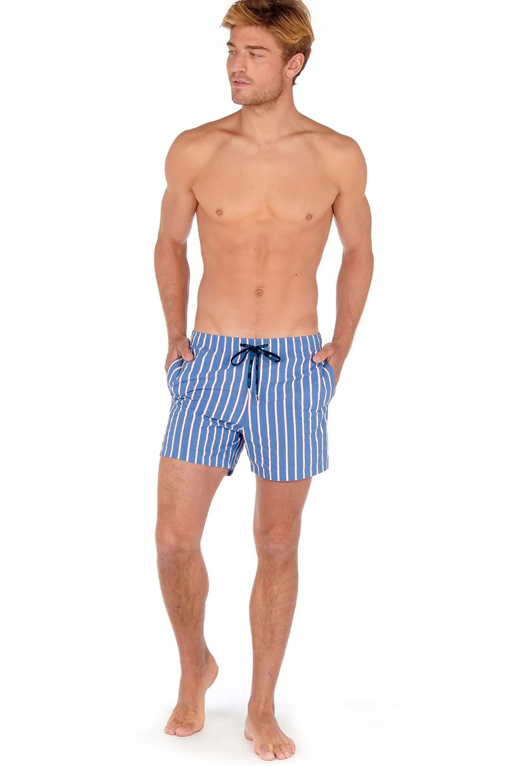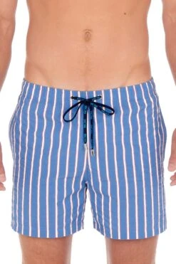 Bade Shorts Plaisance mit Streifenmuster. Der frische und sommerliche Look bringt gute Laune! Die legere Passform, der integrierte Mesh-Innenslip und das robuste, schnell trocknende Mikrofasermaterial sorgen für viel Tragekomfort und den perfekten Sitz zu jeder Zeit. Der elastische Hosenbund ist mit einem Kordelzug kombiniert, sodass die Weite individuell reguliert werden kann. Zwei Seitentaschen plus eine Gesäßtasche sind praktische Details.