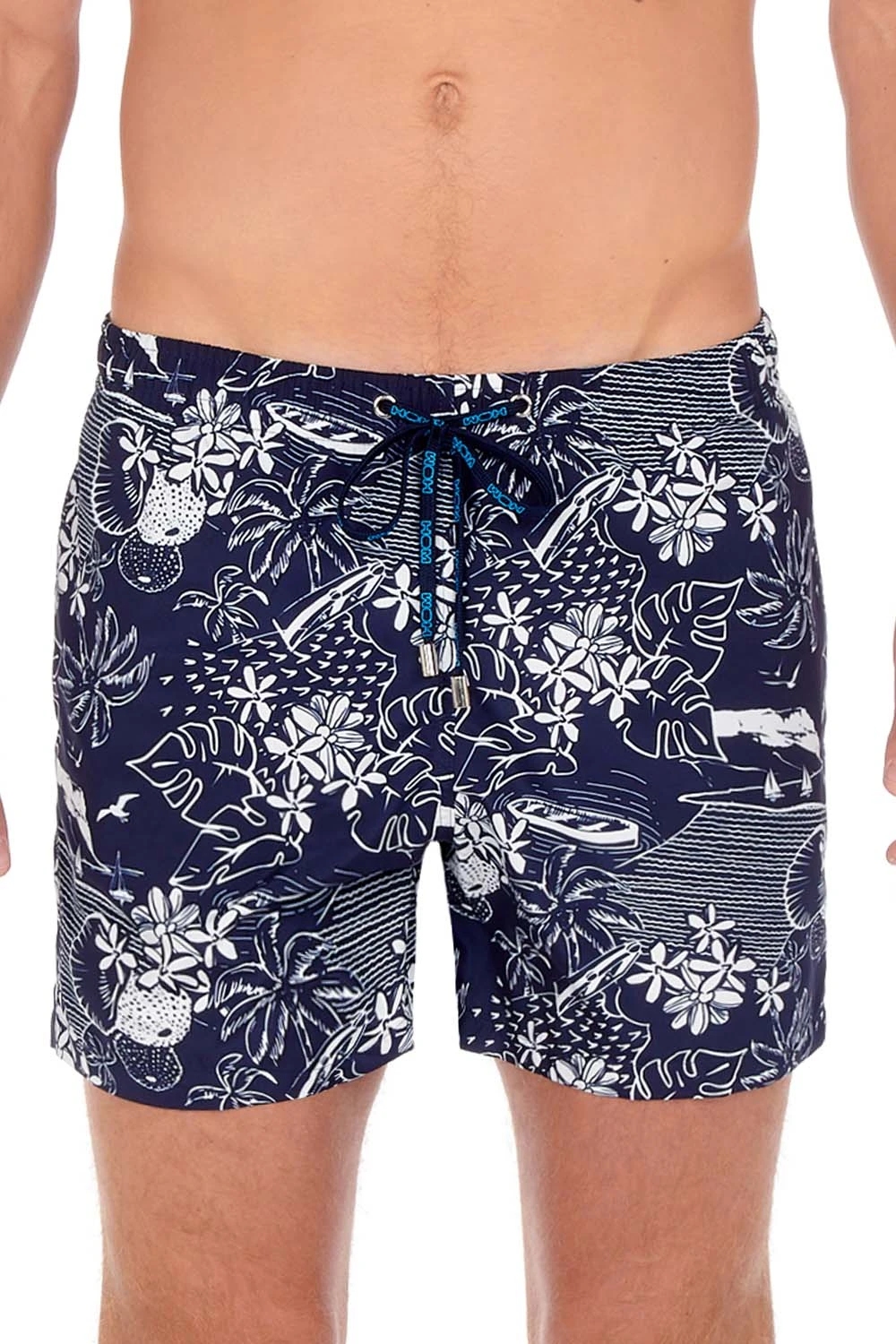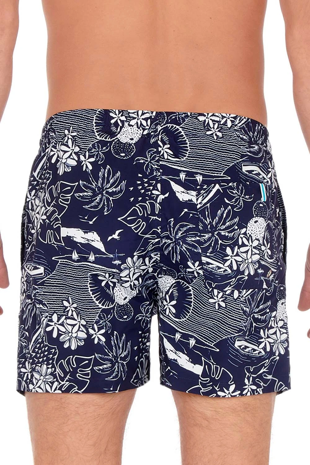 Tropisch. Stilvoll. Unverwechselbar. Diese lässige Beachshorts aus dem Hause HOM verbindet beste Bewegungsfreiheit für den Mann mit einem wunderschönen Design. Auf dunkelblauem Fond zeigen sich stilisierte Palmen, Muscheln, Blumen, Blätter, Boote, … – Motive inspiriert vom letzten Sommerurlaub. Das Modell aus Mikrofaser besticht durch seine lässige Passform mit weitem Bein, einen integrierten Innenslip aus Netzgewebe, praktische Taschen an Seite und Gesäß und eine außenliegende Bindekordel zur Regulierung der Bundweite. Ideal für den Strand und Herren, die es gern bequem mögen. Hinweis: Der Motivausschnitt kann vom Bild abweichen.