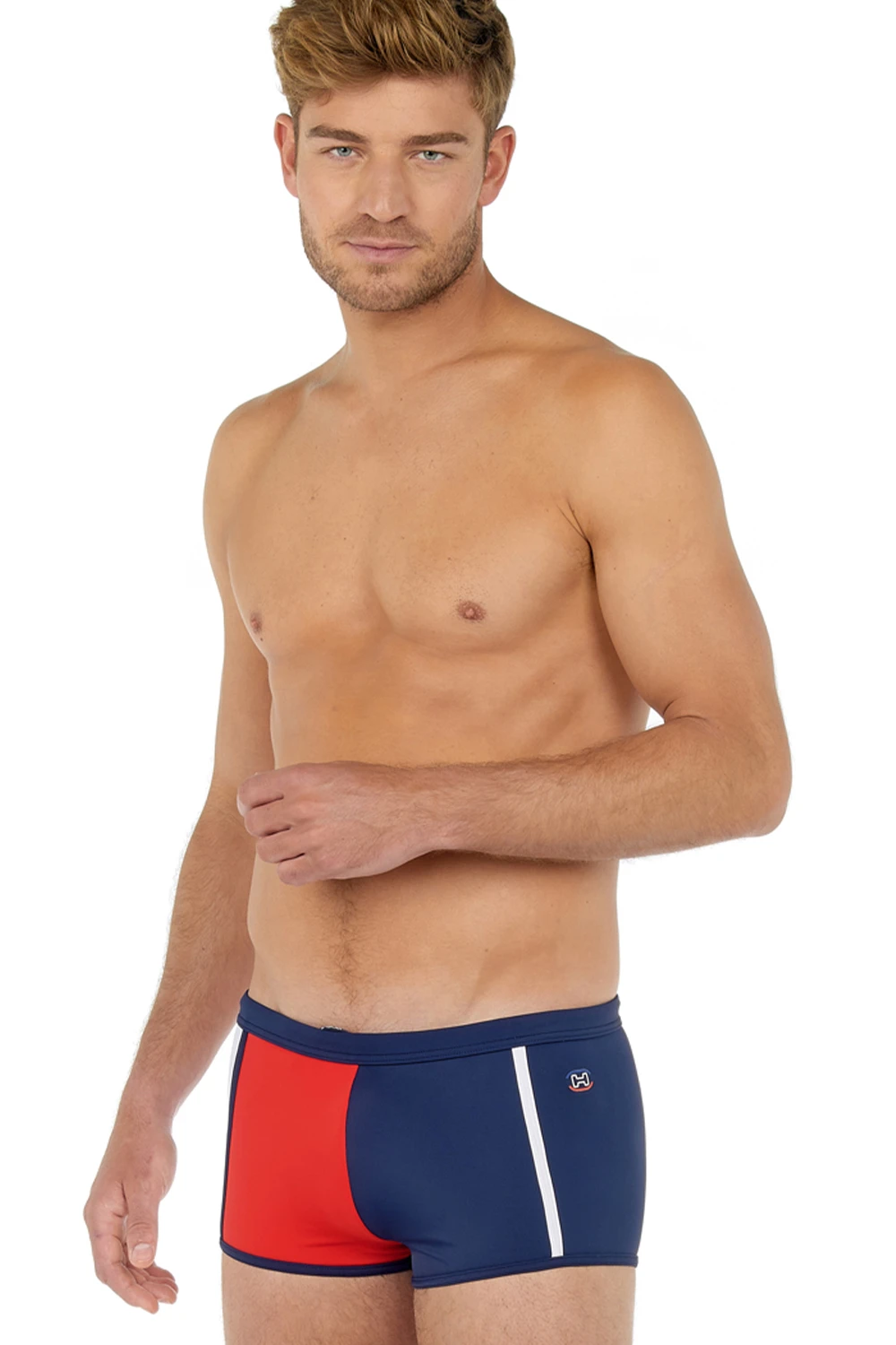 Modern-dynamische Trunk-Form von HOM mit kurzem Bein und eng anliegendem Schnitt. Das Modell ist aus einem schnell trocknenden und sehr angenehmen Material gefertigt, welches sich durch eine hervorragende Passform auszeichnet. Mit dem innen liegenden Tunnelzug mit Bindekordel lässt sich die Weite perfekt regulieren. Die vollständige Innenfütterung verhindert, dass der Stoff bei Nässe transparent wird. Modisches Color Blocking in französischer Tricolore-Interpretation macht die Badeshorts zum Highlight!