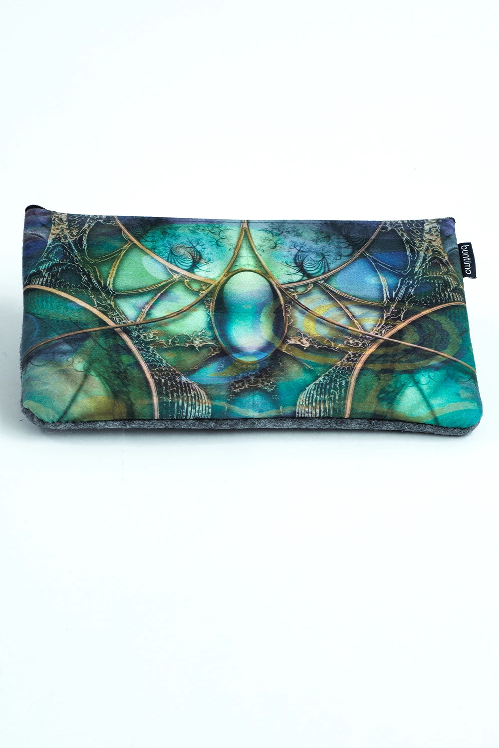Stabile Filztasche mit einem Fach in den Maßen 23 mal 15 Zentimeter. Entlang einer Längsseite des rechteckigen Behältnisses verläuft ein schmaler Reißverschluss. Eine der Außenseiten ist komplett mit einem Schmuckvlies versehen, der ein symmetrisches Fantasiemuster zeigt. Mittig ist ein ovaler Smaragd abgebildet, Schmuckfassungen und Retroambiente umgeben ihn. Die Tasche ist robust und bis auf das kleine textile Markenlabel an der Seite minimalistisch gearbeitet. Sie kann vielseitig zum Einsatz kommen.