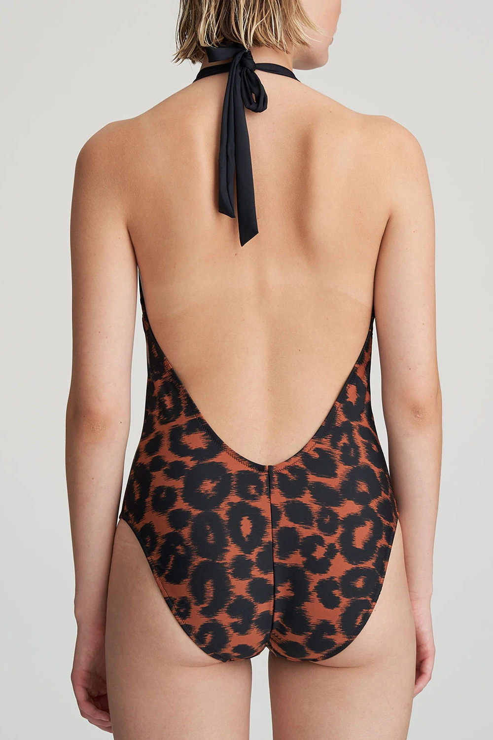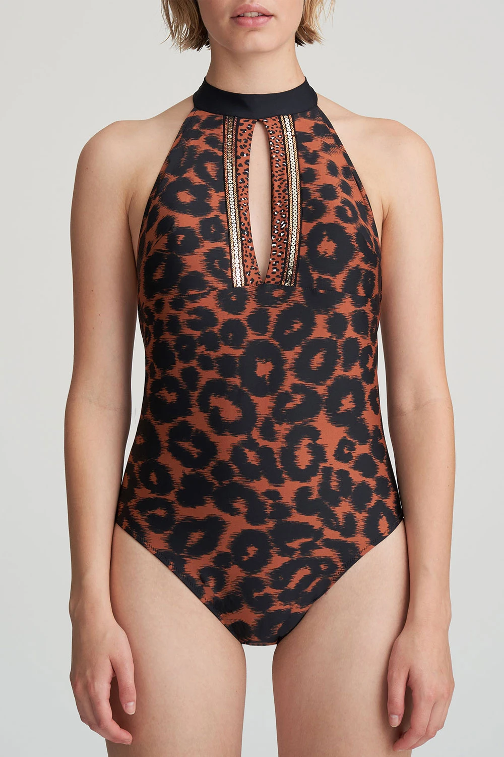 Exklusiver Neckholder-Badeanzug mit sehr tiefem, weitem Rückenausschnitt. An den Enden schräg geschnittene lange Bändchen dienen zum Verknoten im Nacken. Ein Halsband hält die Cuppassen, zwischen denen sich eine beidseits reich mit Pailletten geschmückte Vertikalöffnung befindet. Im Inneren verbergen sich gepolsterte kleine Schalen. Säume mit Zickzacknähten sowie eine Längsnaht am Po sorgen sowohl für ein sicheres Anliegen als auch eine attraktive Silhouette. Dank seines Printstoffs vermittelt dieser tolle, schulterfreie Einteiler ein exotisches Flair.