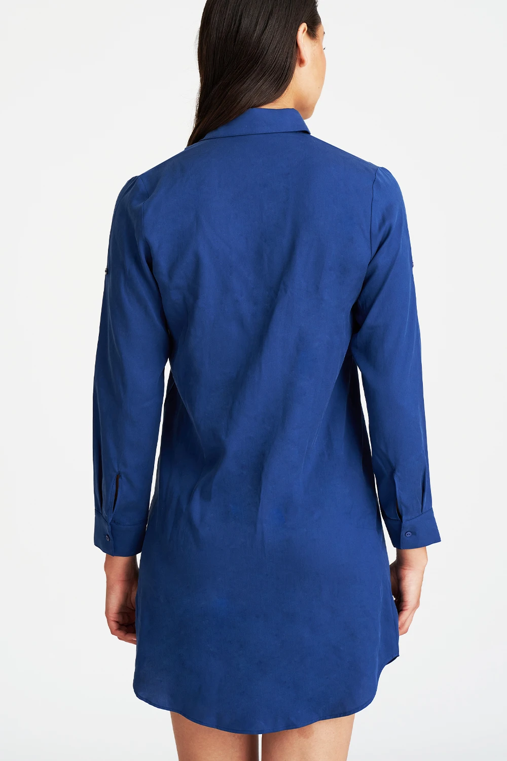 Luftig-leichtes Hemdblusenkleid aus 100% Lyocell. Das Wohlfühlmaterial ist an warmen Sommertagen sehr beliebt, da es glatt und kühl ist und zusätzlich kaum zum Knittern neigt. Die langen Ärmel mit Bündchen lassen sich hochkrempeln und mit Knopf fixieren. Ein tiefer Ausschnitt mit Knopfleiste und Kragen macht das Überstreifen leicht. Bogensaum an den Seiten verrät feminine Eleganz. Dieses Modell ist für viele Anlässe perfekt, ein Must-have zu jeder Tageszeit!