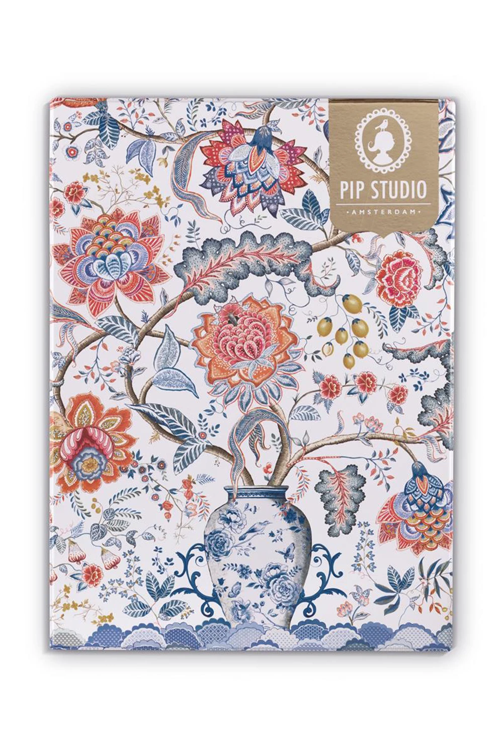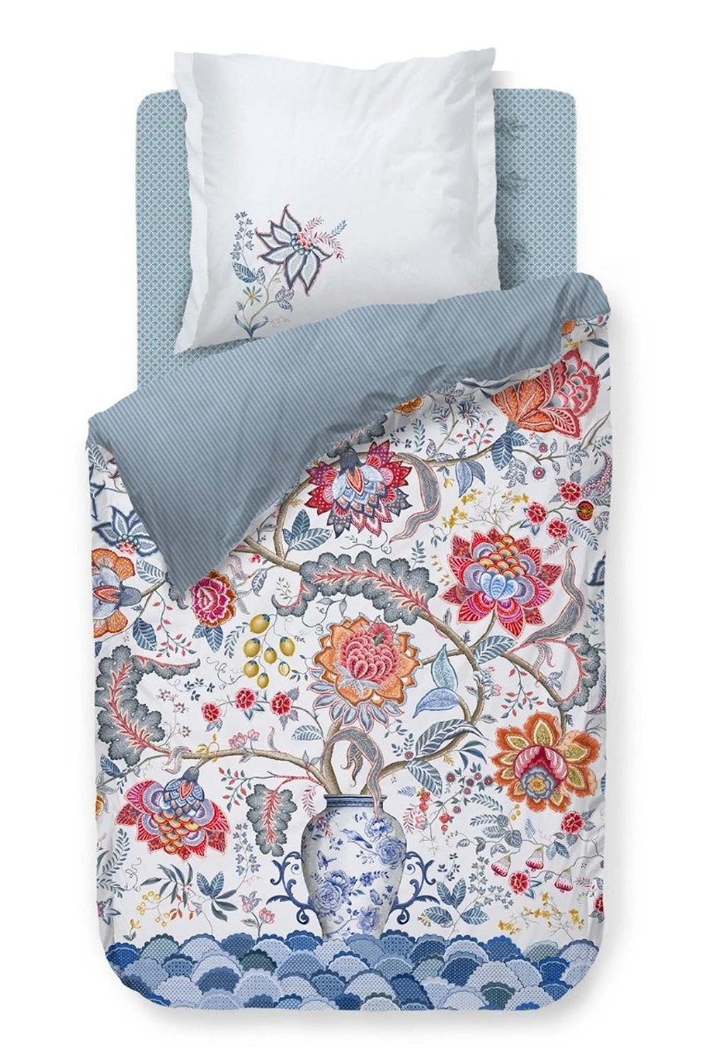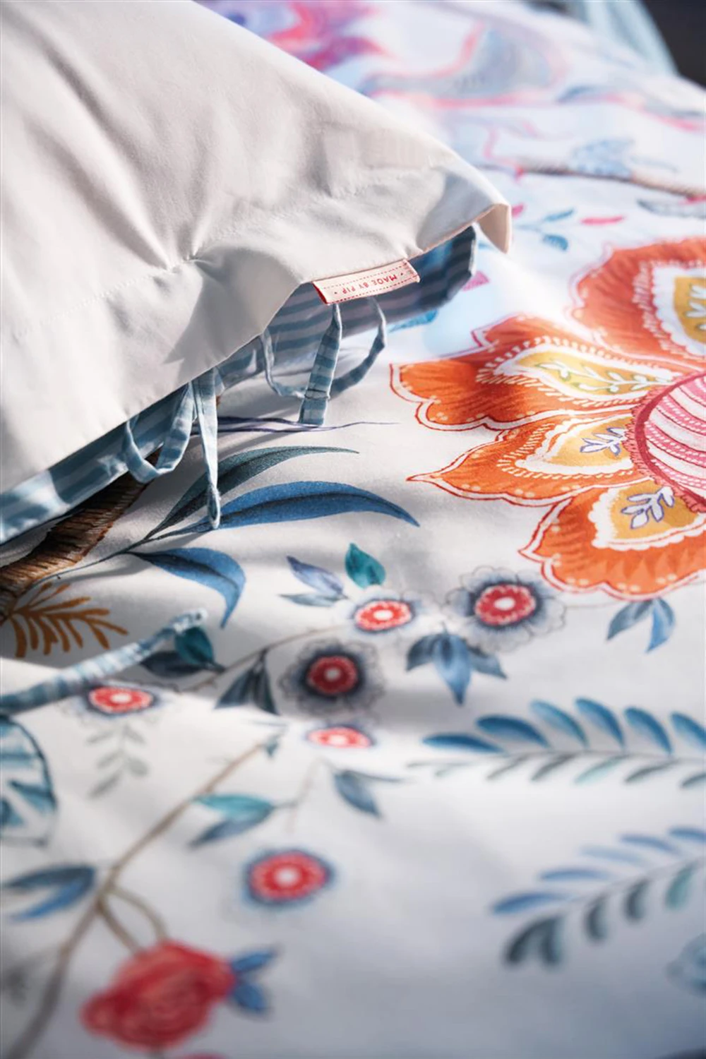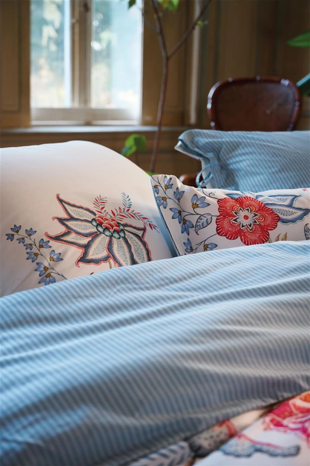 Feine glatte Baumwolle bietet eine gesunde und sehr angenehme Schlafatmosphäre. Dazu kommt bei dieser Wäsche von Pip Studio Amsterdam ein fantasiereiches Blumenmuster, das sowohl symmetrische als auch unsymmetrische Anordnungen von Blüten, Zweigen, Ranken und einer edlen Vase umfasst. Zur dekorativen Seite gesellt sich eine fein gestreifte andere – als Kontrast und zum beliebigen Verwenden. Das Kopfkissen ist dagegen sparsamer mit nur einer Blüte dekoriert, rückwärtig aber ebenfalls fein gestreift. Bei ihm haben die Seiten einen abgesteppten Rand, eine dient zum Einschieben des Kissens und wird mittels mehrerer Bändchen verschlossen. Landhausstil vom Feinsten.