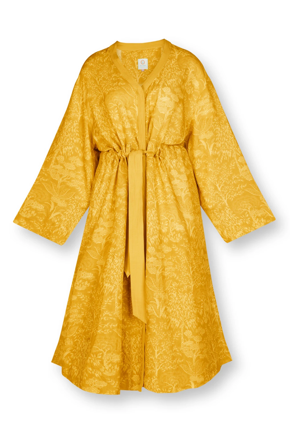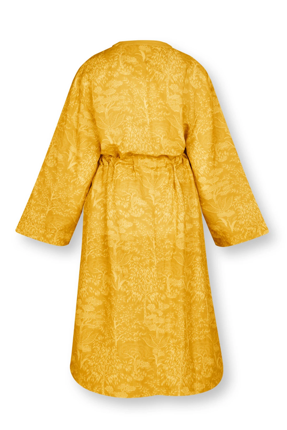 Dieser Kimonomantel strahlt wie die Sonne! Der fast Ton in Ton im japanischen Stil gemusterte Stoff schimmert im Licht. Typische überschnittene Schultern, weite lange Ärmel und ein breiter Tunnelzug um die Taille zeichnen ihn aus. Das angesetzte Revers und der lange Gürtel sind aufwendig gesteppt und einfarbig, elegant wirken die schrägen Band-Enden. Im geschlossenen Zustand ergibt sich ein v-förmiger Ausschnitt. Dieses tolle Modell aus Viskose und Baumwolle bietet zum optischen auch einen Tragegenuss sowie bequeme Weite.