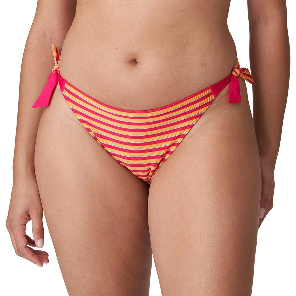 Die Bändchen dieses Hüftslips mit eleganten Streifen können Sie selbst binden, damit der Bikinislip immer perfekt sitzt.