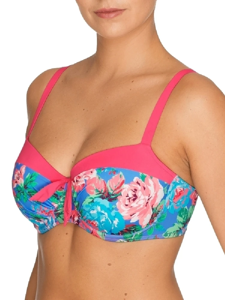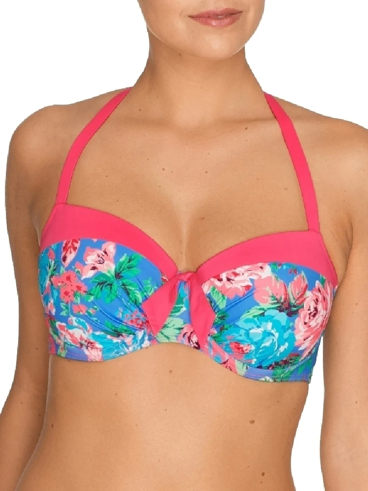 Sexy Bikini-Oberteil mit Bandeau-Ausschnitt und unterlegten Cups, mit Blumenprintmuster. Der breite, glatte Stoff oberhalb der Cups setzt ein volles Dekolleté extra in Szene; extra femininer Retro-Touch. Die Träger lassen sich verstellen und auch um den Nacken legen.
