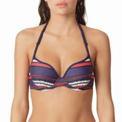 Herzförmiges Bikini-Oberteil mit einer feinen, gestreiften Textur, einem Bügel und vorgeformten, unterlegten Cups. Die Bändchen lassen sich einstellen und auch als Neckholder tragen. Der hübsche Ring und die goldfarbenen Regler am Einstellbändchen verleihen dem Design ein besonderes Cachet.