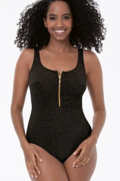 Ein sinnlich-glamouröser Strandlook gelingt mit dem Klassiker Elouise von Rosa Faia, der seine Trägerin gekonnt in Szene setzt. Der Einteiler aus Bademodenstoff mit goldenem Lurex verfügt über Brustfutter ohne Bügel, das eine leichte Unterstützung bietet. Der goldfarbene Reißverschluss am runden Ausschnitt ist ein beachtenswertes Detail. Relativ schmale Träger führen über die Schultern, längenverstellbare Abschnitte schließen sich hinten an den Ringen an. Der sportliche Badeanzug hat einen tief ausgeschnittenen Rücken. Alle Ränder sind dank Zickzacknähten elastisch versteppt.