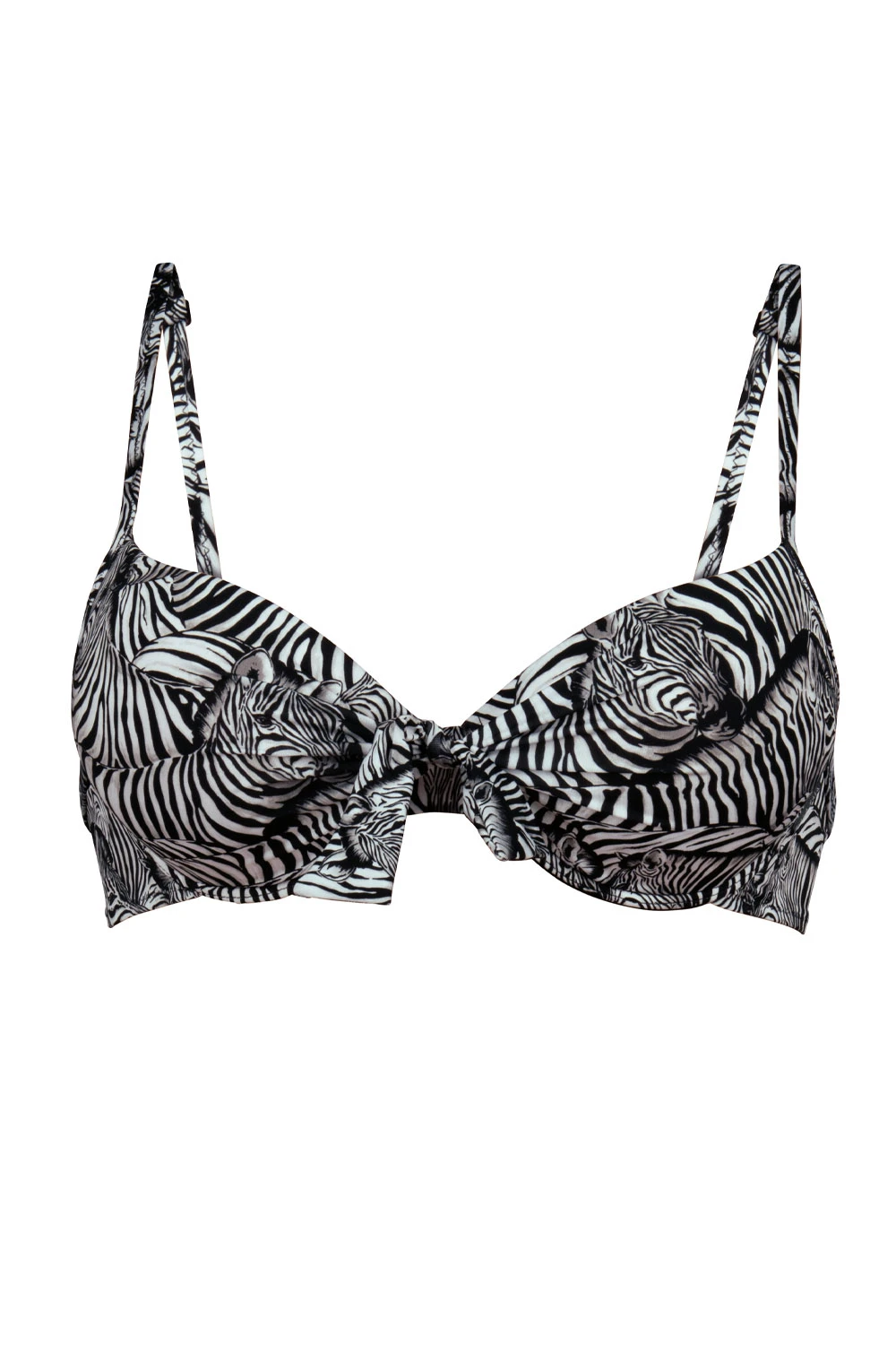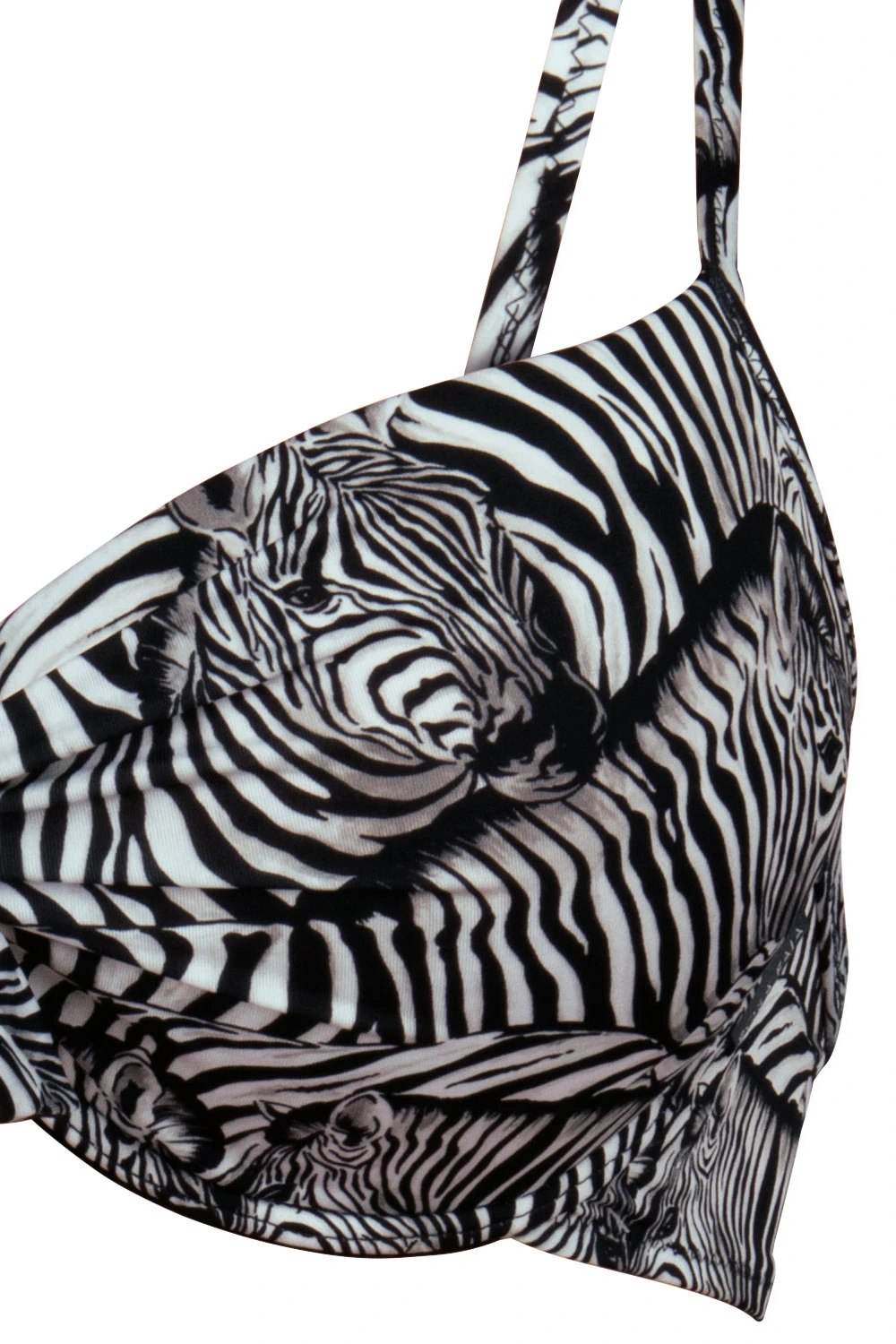 Interessantes Zebramuster kennzeichnet dieses Bikini-Top. Dabei sind es nicht nur Streifen, sondern das ganze Tier wird fotografisch aufregend in Szene gesetzt. Das Oberteil mit integrierten Bügeln verfügt über stabile, formgebende und kaschierende Schalen, sodass ein gewohnt sicheres Gefühl wie beim Tragen eines BHs entsteht. Die elegante Raffung im Cup, die mittige Schleife und schmale, am Rücken verstellbare Träger sorgen für ein feminines Bild. Als Teil dieser Mix-&-Match-Serie kann das Top zu verschiedenen Höschen kombiniert werden.