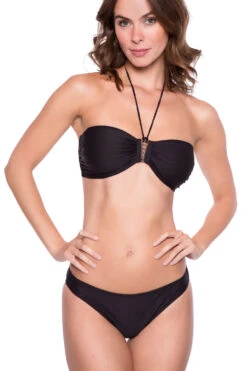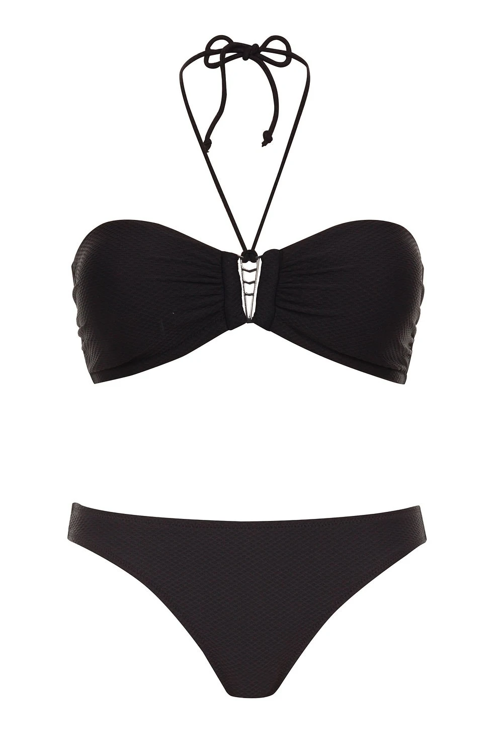 Dieses Bikini-Set besteht aus einem Bandeau-Oberteil mit abnehmbaren Neckholder-Spaghettibändern und einem puristischen Slip mit schmalen Seiten. Der Blickfang: das elegante goldfarbene Metallelement am Mittelsteg, das zugleich die Cups verbindet, aber auch die Busenmitte betont. Eingearbeitete blickdichte Schalen optimieren die Passform und sorgen für einen attraktiven Look. Mit seinem gewaffelten Stoff vermittelt dieser Zweiteiler ein spürbar gutes Gefühl. Splitting: Rücken breiter ab 40.