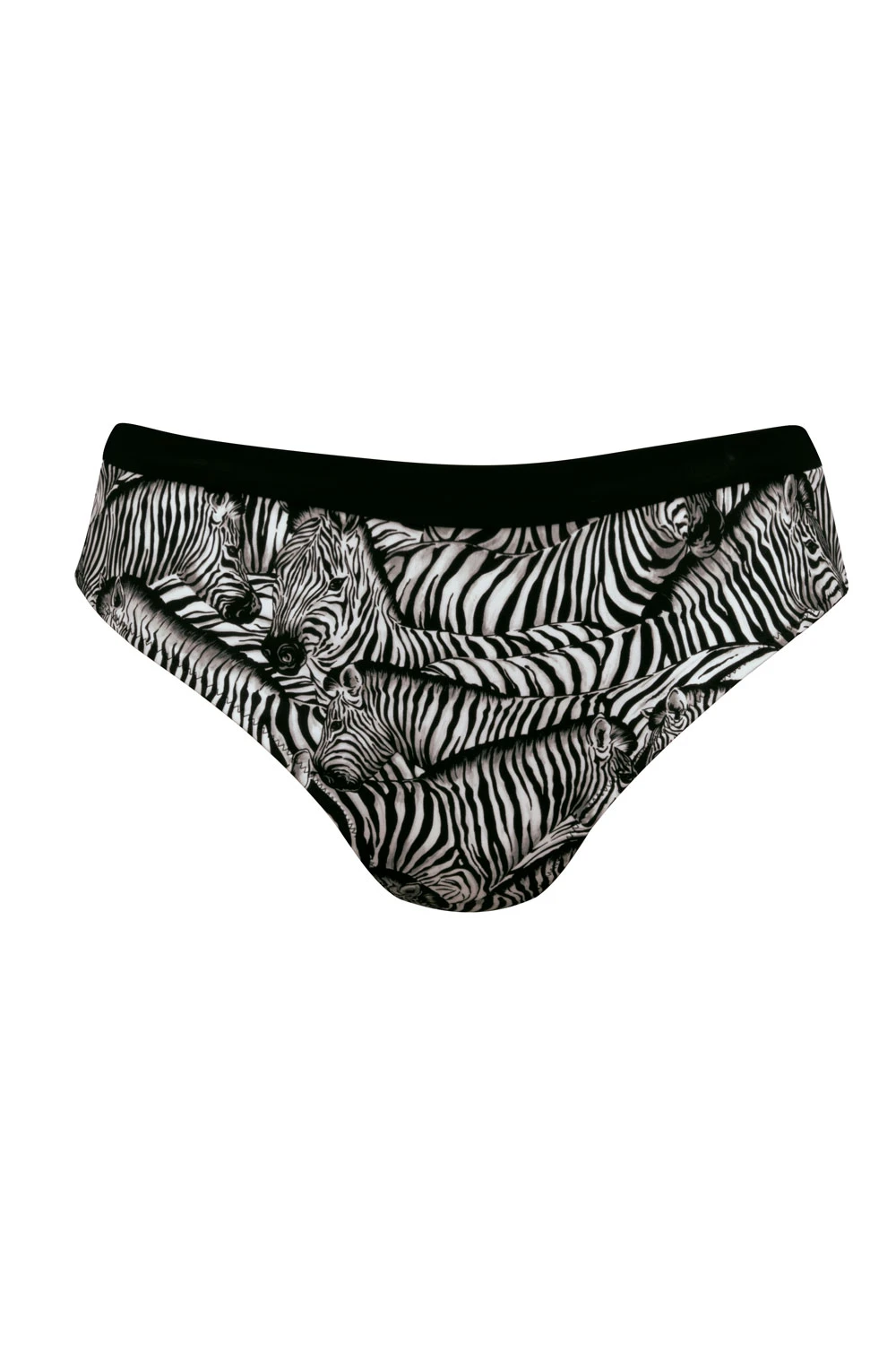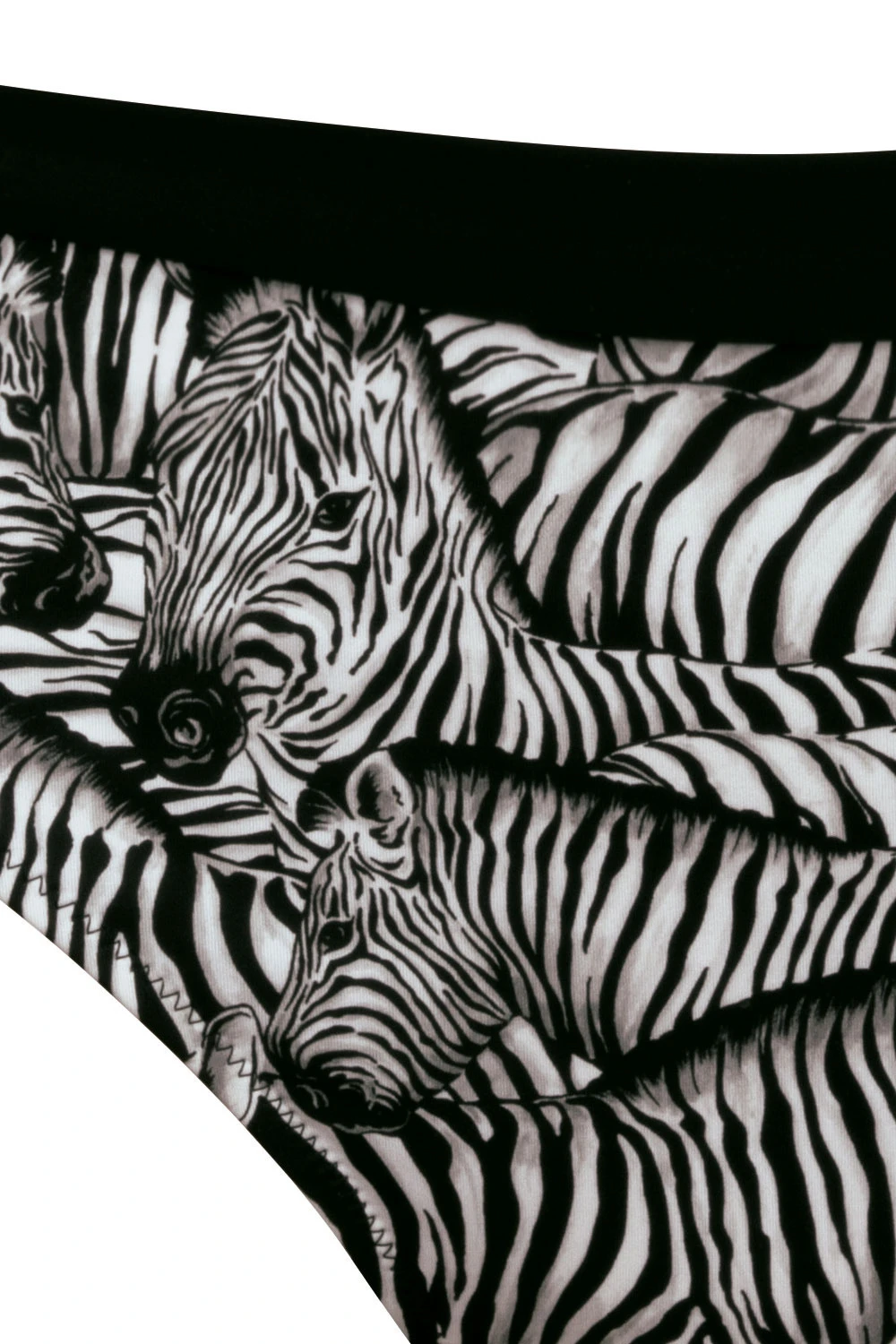 Puristisch geschnittenes Bikini-Höschen, das durch sein raffiniertes Zebra-Printmuster die Blicke auf sich lenkt. Ein schwarzer Bundstreifen wirkt konturierend. Zudem verhindert hochwertiges Anita-Sichtfutter eventuelle Transparenzen. Als Teil der Mix-&-Match-Serie kann dieser Bade-Slip mit den verschiedenen Tops kombiniert werden.