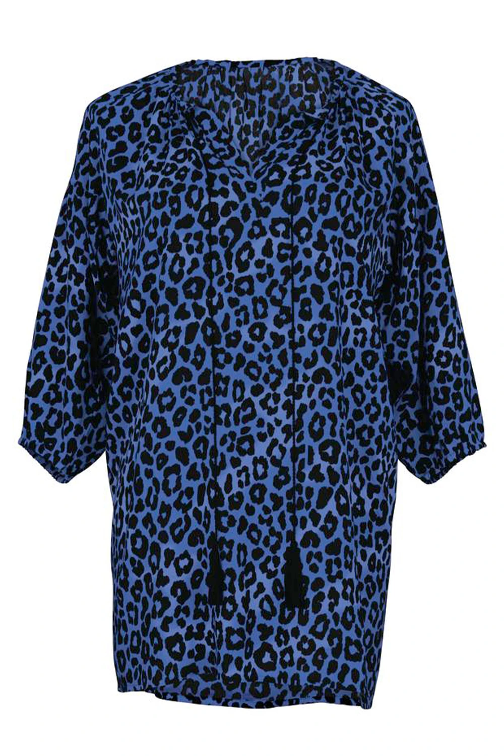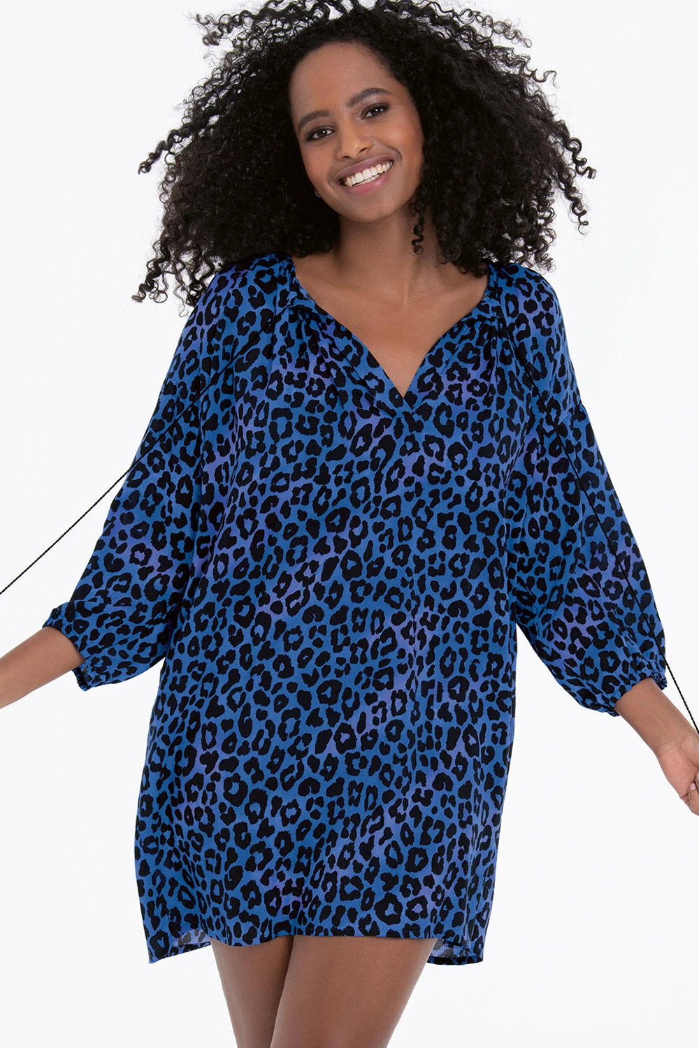 Luftige Tunika aus Viskose – für ein unbeschwertes Strand-Outfit. Die lange Bluse folgt einem geraden Schnitt entlang des Körpers und ist unten gerade knapp versäumt. Durch die überzogenen Schultern entsteht viel Weite. Angesetzt sind dreiviertellange Ärmel mit lockerem Gummizug an den Enden. Die Halsöffnung wurde mit einem V-Ausschnitt gearbeitet, ganz dünne lange Kordeln mit Quasten bilden den Schmuck am Modell, das die Serie Batik Safari wunderbar ergänzt.