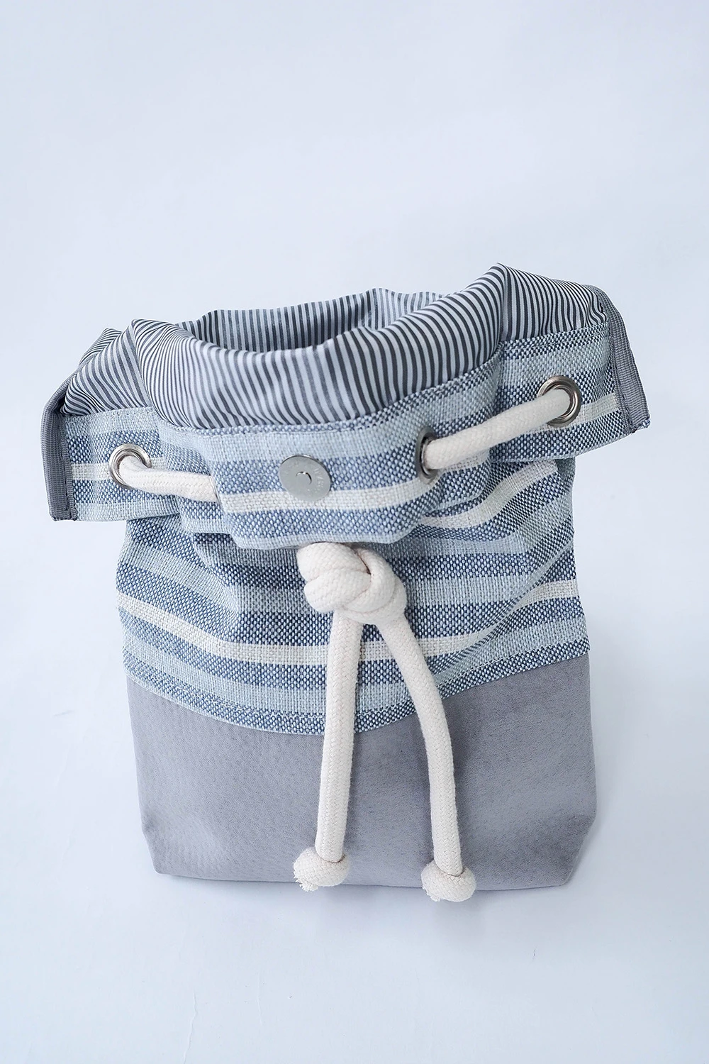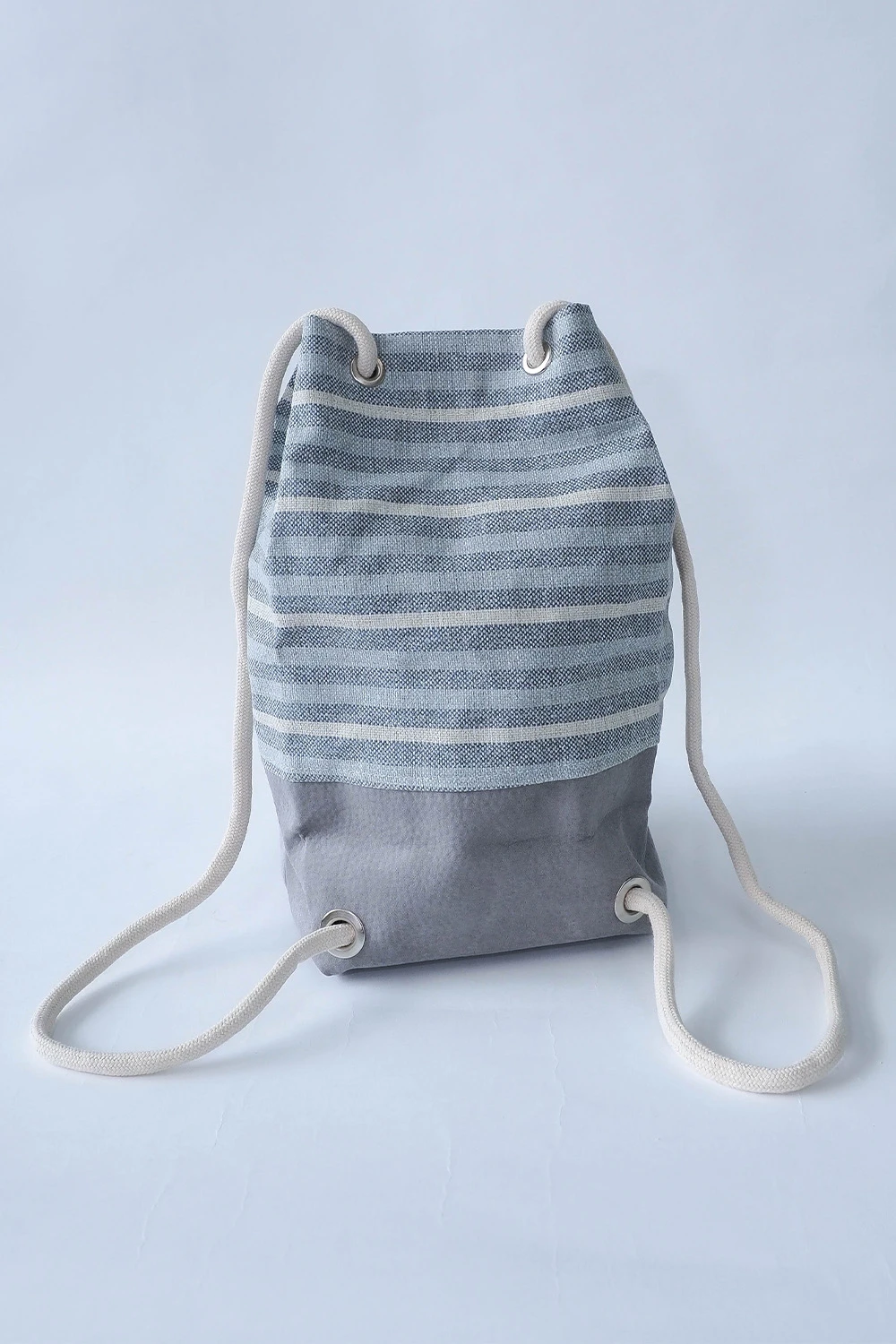 Rucksack Lili zeigt sich in einem Seemannsdesign mit modernem starken Seil, das zugleich als Verschluss und Trageriemen dient. Dekorativ hängen die Enden mit dickem Knoten über der Vorderseite. Der quer gestreifte Stoff in Canvas-Optik aus hochwertigem Polyester und strapazierfähiges EKO-Leder bilden die Außenhaut, das Innenfutter ist wasserabweisend und integriert ein Reißverschlussfach für wichtige Dinge. Das schmale, tiefe Gefäß verfügt über einen Magnetverschluss. Vorn mittig bildet das buntimo-Label einen dezenten Schmuck. Das in der EU fair trade handgefertigte Produkt vereint im Style Crossbody Bag, Rucksack und Tasche. Maße ca. 35x25x14cm (H/B/T).