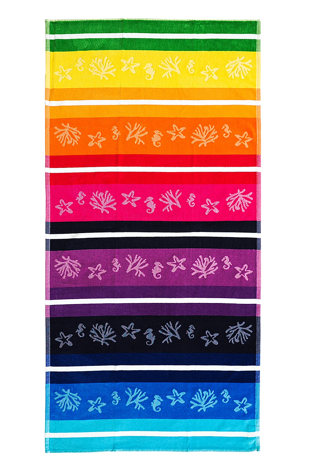 Das trendige Easyhome XXL Handtuch Beach Color aus 100% Baumwolle (Velours, 320 g/m2) eignet sich ideal zum Abtrocknen und Drauflegen. Es ist hautfreundlich, saugstark, schnell trocknend, super flauschig und lässt sich platzsparend aufbewahren. Harmonisch aufeinander abgestimmte Farben bestimmen das Streifen-Design, das mit stilvollen Strandmotiven wie Muscheln, Eis oder Fischen abgerundet wurde. Ideal für Schwimmbadbesuche, Sauna, Wellness oder Strand. Die Maße dieses Handtuchs sind 90×165 cm.