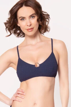 Dieses Bralette-Bikini-Top zeigt sich wunderbar unkompliziert. Mit seinen schmalen Schulterbändern und dem eleganten goldenen Ring im Ausschnitt wirkt es puristisch feminin, der strukturstarke bi-elastische Stoff charakterisiert es als Swimwear. Äußerlich nicht sichtbar verfügt das Oberteil über fest eingearbeitete Foamcups, sodass sich auch in nassem Zustand nichts abzeichnet. Als Komfortplus sind die multifunktionellen Träger zu nennen: So lässt sich das hübsche Top der Körperform optimal anpassen. Zudem gibt es innerhalb dieser Serie vier Höschen, mit denen es zum Bikini komplettiert werden kann.