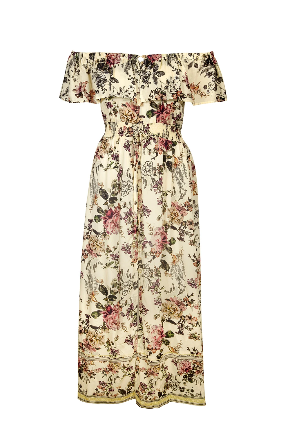 Lassen Sie sich das It-Piece der Saison nicht entgehen! Feminines, bedrucktes Midi-Kleid mit Volants, das schulterfrei zu tragen ist. Der kühle Viskosestoff ist über und über mit magischen Vintage-Blüten und Blättern verziert, die den aktuellen Retro Patchwort neu interpretieren. Durch gesmokte Verarbeitung im Schulterbereich und an der Taille sitzt das Modell sehr angenehm und fällt ansonsten gerade bis in Wadenmitte herab. Platzierte Borten am Saum verleihen eine grazile Wirkung.